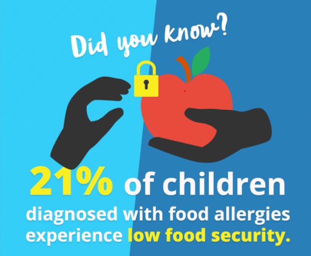 Emily’s story is not uncommon. Most charitable and federal food programs have extremely limited options in terms of food allergies. Oftentimes, clients cannot even pick out their own food, but are rather given pre-selected bags filled with food that may or may not work for people with allergies. Even if food assistance programs do offer safe foods, they are likely not adequate alternatives to typical foods. In the case of Emily, salsa and potatoes were the only option. In other cases, the alternatives offered do not work for people with multiple food allergies (i.e. almond butter might be offered instead of peanut butter for people with a peanut allergy… but many people are allergic to both peanuts AND tree nuts). Finally, meal services, reduced price school lunches, and soup kitchens are also nearly impossible for food allergy sufferers due to the risk of cross contamination.